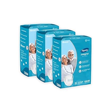 Dignity Magna Adult Diapers Tape Style - 30 Count (Extra Large) with Extra Absorbent Core, Wetness Indicator, Waist Size 48" - 57", 10 Pcs/Pack (Pack of 3) is one of the best selling online in India and has a very good customer rating and reviews .